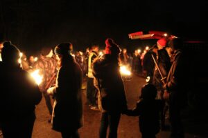 Traditionell geht es mit der Waldwanderung mit Fackeln zum Dahenfelder Bahnhof. Gemeinsam wird dort der Weihnachtsbaum erleuchtet und eine Weihnachtsgeschichte vorgetragen. Der Posaunenchor wird dazu verschiedene Weihnachtslieder anstimmen. Anschließend laden wir ein zu Glühwein und Punsch sowie Grillwürsten (auch vegan) und Weihnachtsgebäck.